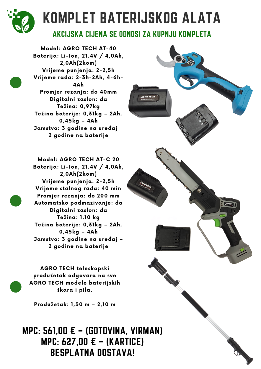 Baterijske škare AGRO TECH AT-40 konstruirane su za profesionalnu i učestalu upotrebu te omogućuju brzu i ugodnu rezidbu. Ove robusne škare kombiniraju učinkovitost i pouzdanost u isto vrijeme. U kombinaciji s baterijama od 21.4 V bez poteškoća režu grane do promjera 40 mm.